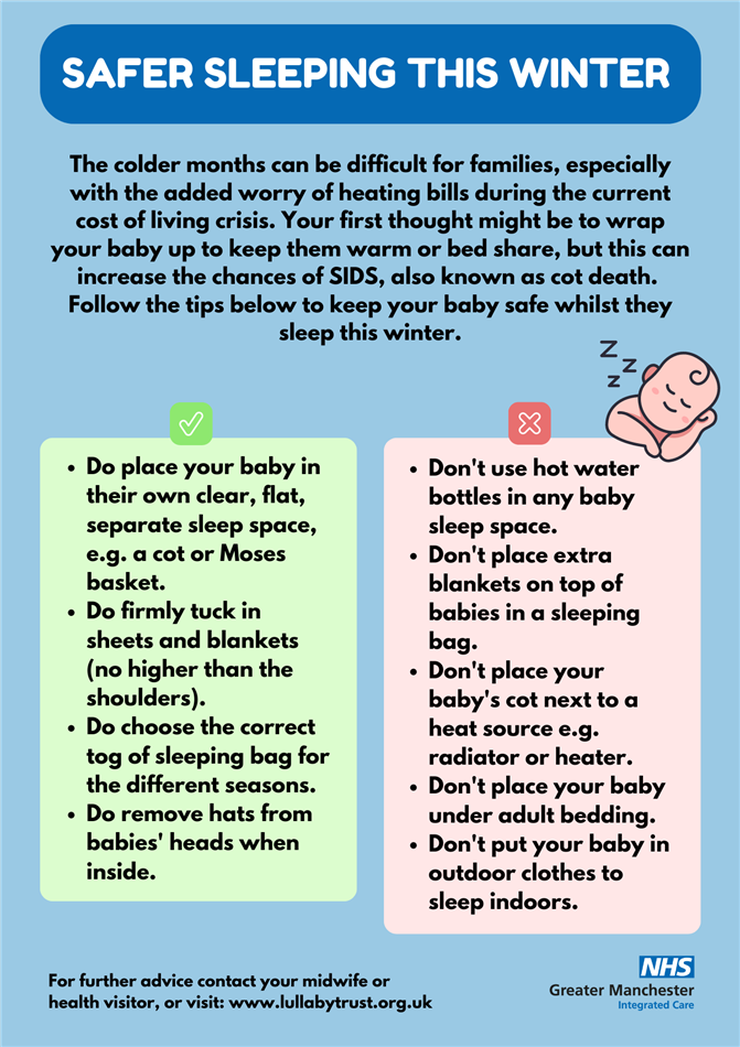 Sudden Infant Death Syndrome (SIDS) is the sudden and unexplained death of a baby where no cause is found. Sadly, around four babies a week still die from SIDS. Since 2017 in Rochdale, safe sleep has been identified as a key theme in two Serious Case Reviews and one Health Review. If everyone who cares for a baby knows about safer sleep advice many lives could be saved.